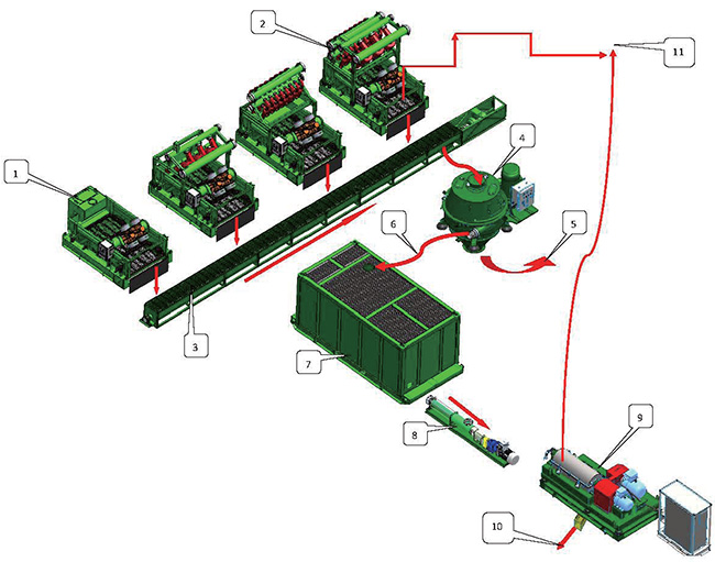 鉆井泥漿不落地處理工作流程說明如下:鉆機過來的泥漿通過高架管匯進入振動篩(1)、清潔器(2),經過(1)、(2) 處理排放的鉆屑通過螺旋輸送器(3)輸送至立式甩干機處理(4)。立式甩干機處理完的固體通過廢渣(5) 排除,回收到的鉆井泥漿(6)進入鉆井液泥漿罐體(7),離心機供液泵或螺桿泵(8)抽取含有細固 顆粒的回收泥漿,供給離心機(9 )處理,固體部分通過固體排渣口(10)排除,處理完成的鉆井液通 過干凈泥漿回歸泥漿系統(tǒng)(11)。