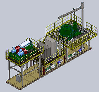 工作時候,將鉆屑甩干機支架升高到最高處,能夠滿足鉆屑甩干機的鉆屑排放。離心機放于翹座的罐體上, 排出的液相部分直接流入到底部的收集罐中,需要輸送鉆井液時候,可以通過一臺輸送泵進行輸送或將 此罐體與相近高度的罐體進行連接。