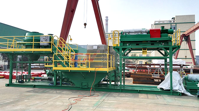 本套撬裝系統(tǒng)分為三個(gè)部分,撬裝兩端是用來(lái)安裝鉆屑甩干機(jī)單元和廢漿專(zhuān)用的沉降臥螺離心機(jī)單元。中間部分設(shè)有一個(gè)圓錐型泥漿罐,用來(lái)存儲(chǔ)從鉆屑干燥單元排放出的液相部分,甩干機(jī)及離心機(jī)的變頻控制部分安裝于錐形罐的上方,為控制設(shè)備及監(jiān)控設(shè)備運(yùn)行狀態(tài)提供了方便。